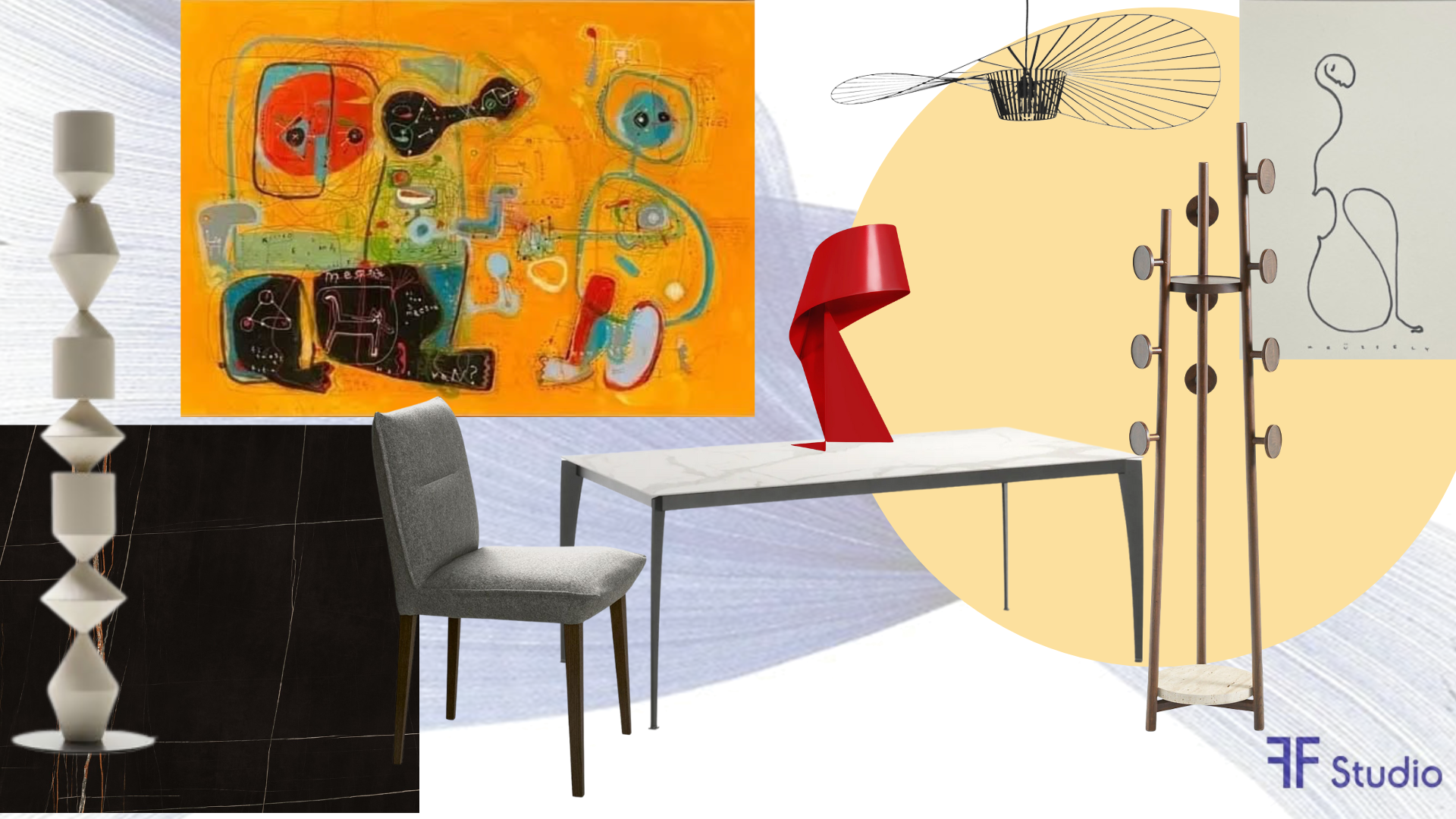 un mobilier aux lignes sobres et contemporaines, des matières douces et texturées pour apaiser la composition, et des touches colorées — jaunes, rouges, bleus — en écho direct aux tableaux.