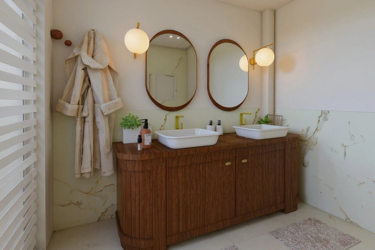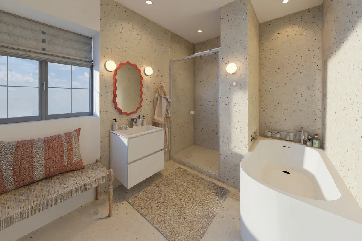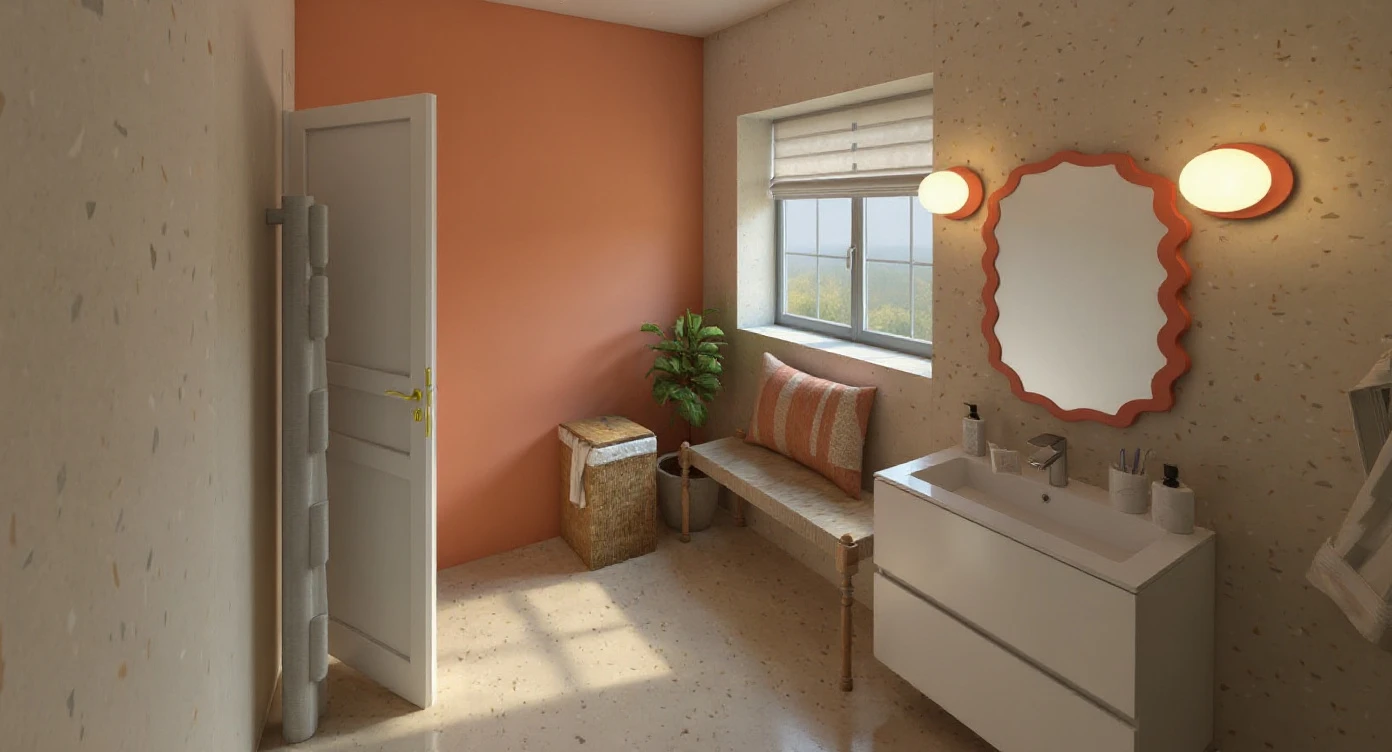 Un banc berbère, un miroir aux lignes organiques et un éclairage doux viennent compléter l’ensemble, créant une atmosphère accueillante, chaleureuse et joyeuse, sans tomber dans un univers enfantin figé.