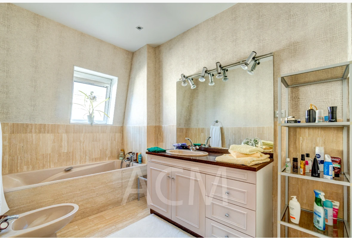 La salle de bain parentale a été pensée comme un lieu refuge, dédié à la détente et au confort.